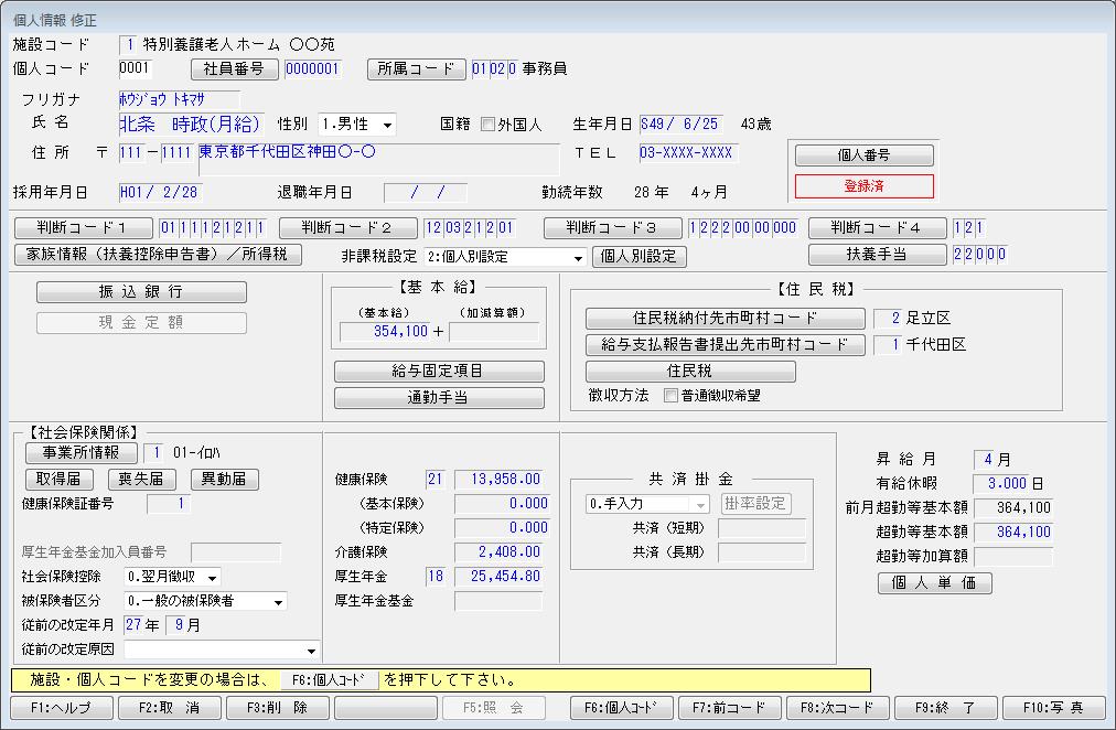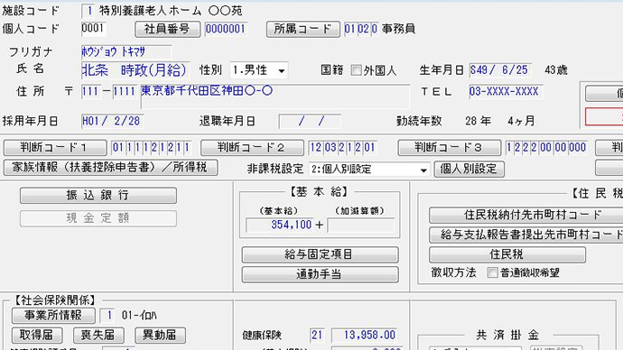 | 月次処理 | 給与変動項目一覧表、次期昇給者一覧表、給与明細書、 地方税納付一覧表、銀行振込一覧表、金種一覧表、累積一覧表、 各経費一覧表、社会保険分析表、賃金台帳、社会保険改定通知書 |
