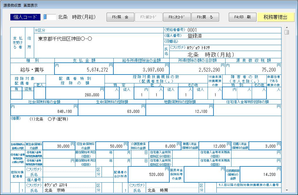 | 年末調整 | 年末調整データ一覧表、年末調整チェック一覧表、年末調整変動データ一覧表、源泉徴収票、源泉徴収簿、源泉徴収過不足一覧表、年末調整計算一覧表、給与所得の源泉徴収票合計表、給与支払報告総括表、現金還付明細書、銀行振込一覧表(現金還付者)、金種一覧表、給与等の支払状況内訳書、源泉徴収納付一覧表 |