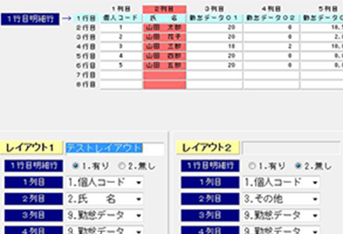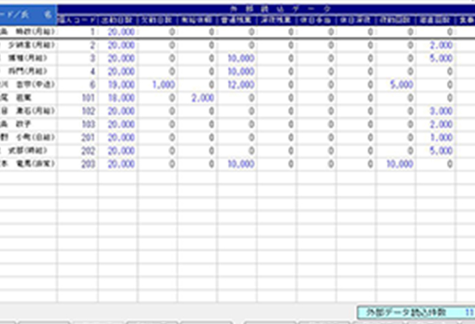 『外部データ連携オプション』は、Excelなどの表計算のデータやタイムレコーダーのデータ〔CSV形式(カンマ区切り)〕を読み込んで、給与計算・月例処理の給与変動項目(勤怠データ)に一括で書き込むことができます。