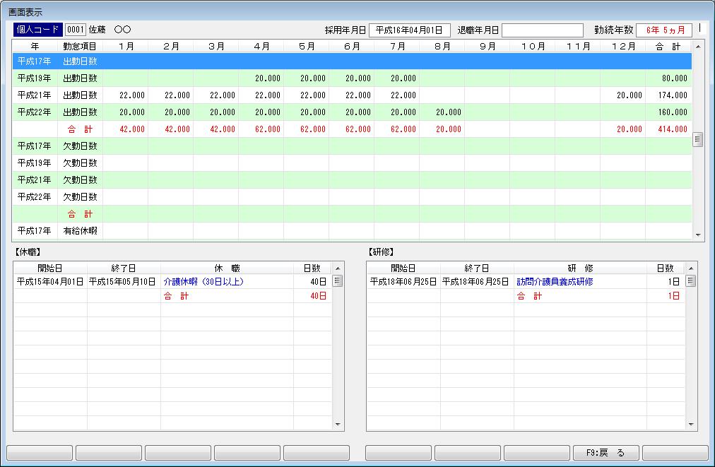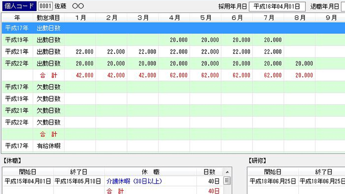 育児休暇・休職/研修情報を管理することで、「実務経験日数一覧表」を出力できます。介護福祉士受験資格の実務経験日数算出時に利用することができます。