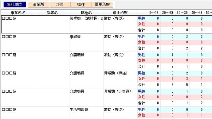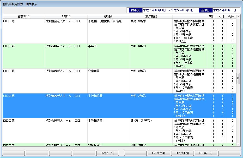 雇用形態ごとに資格取得者数を集計できる「資格取得状況一覧表」、前年度の採用・退職者も把握できる「勤続年数一覧表」をはじめ、 平均年齢を把握できる帳票等もご用意していますので、監査資料や各種調査書へ活用できます。