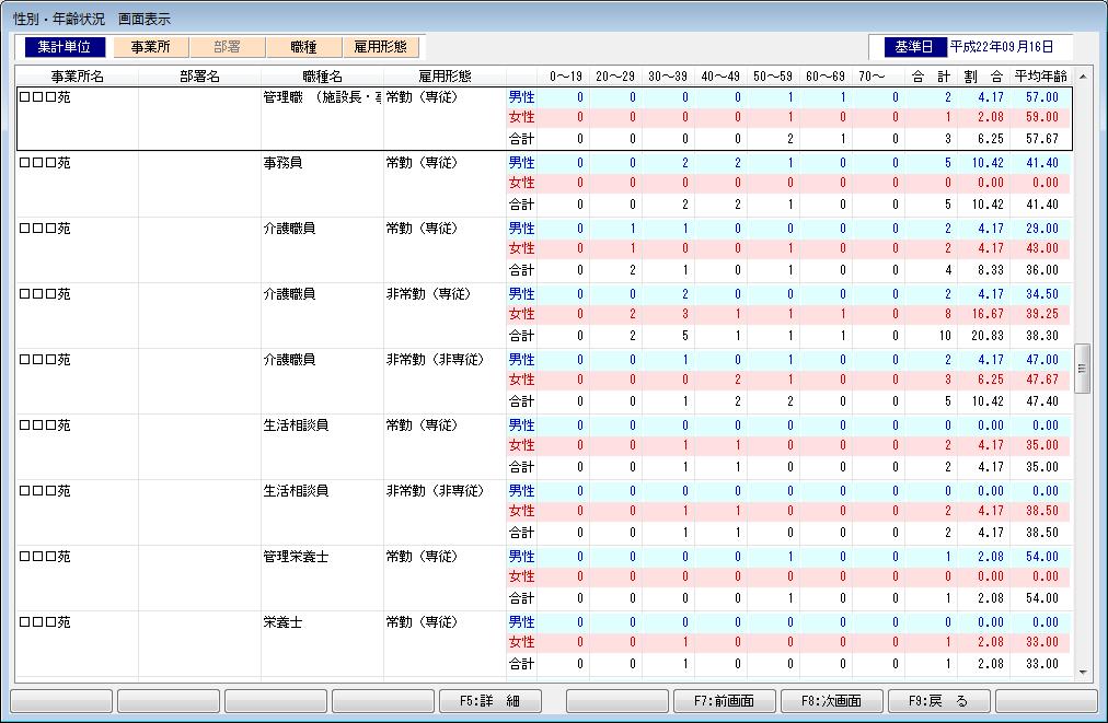 採用・退職・職務/人事異動/育児休暇・休職/昇給記録/取得資格免許などの詳細情報を一元管理できます。 これにより、「俸給表人員一覧表」や「性別・年齢状況一覧表」などの統計資料を出力できます。
